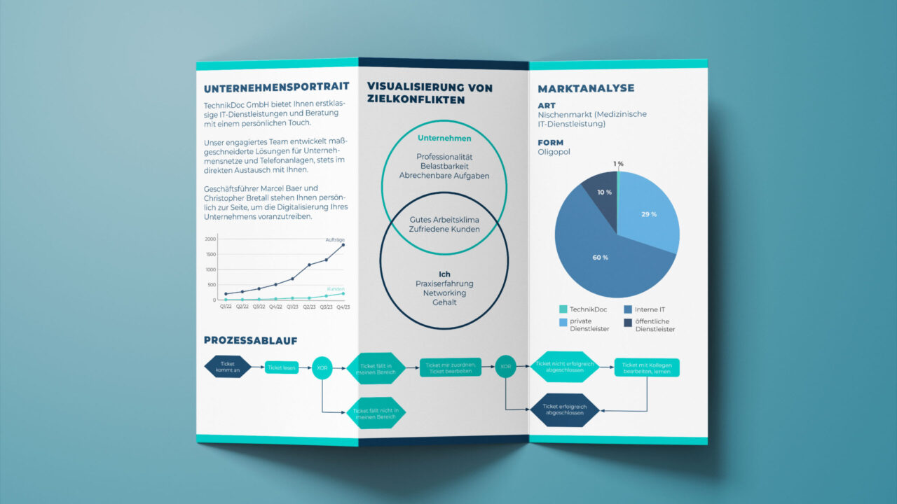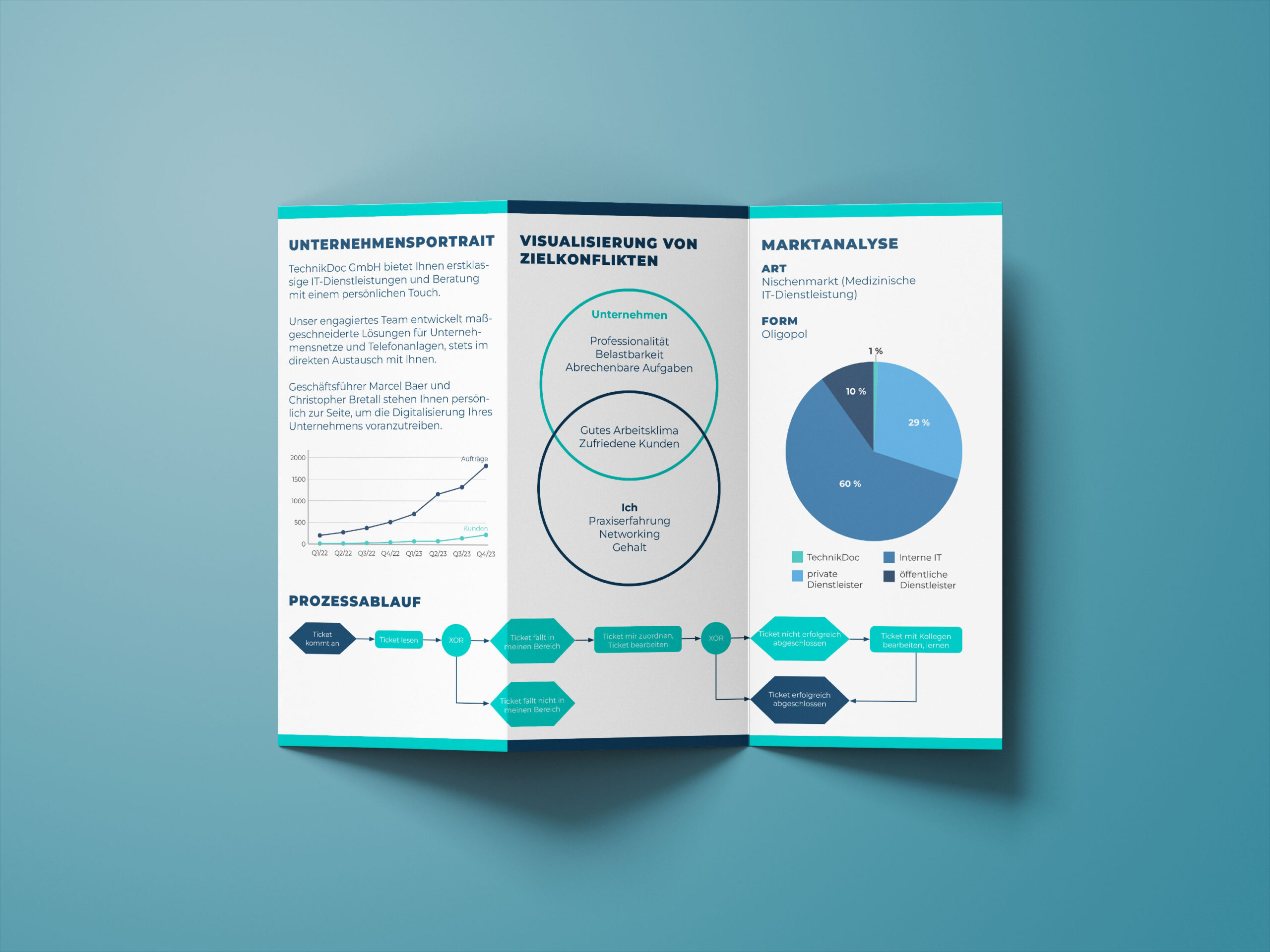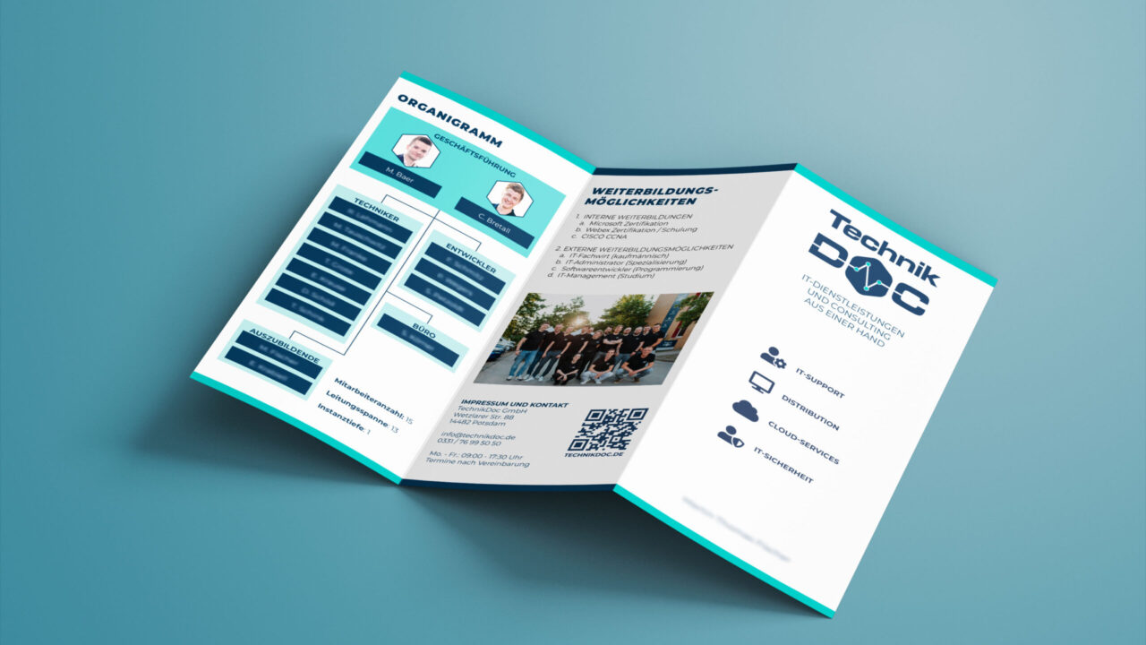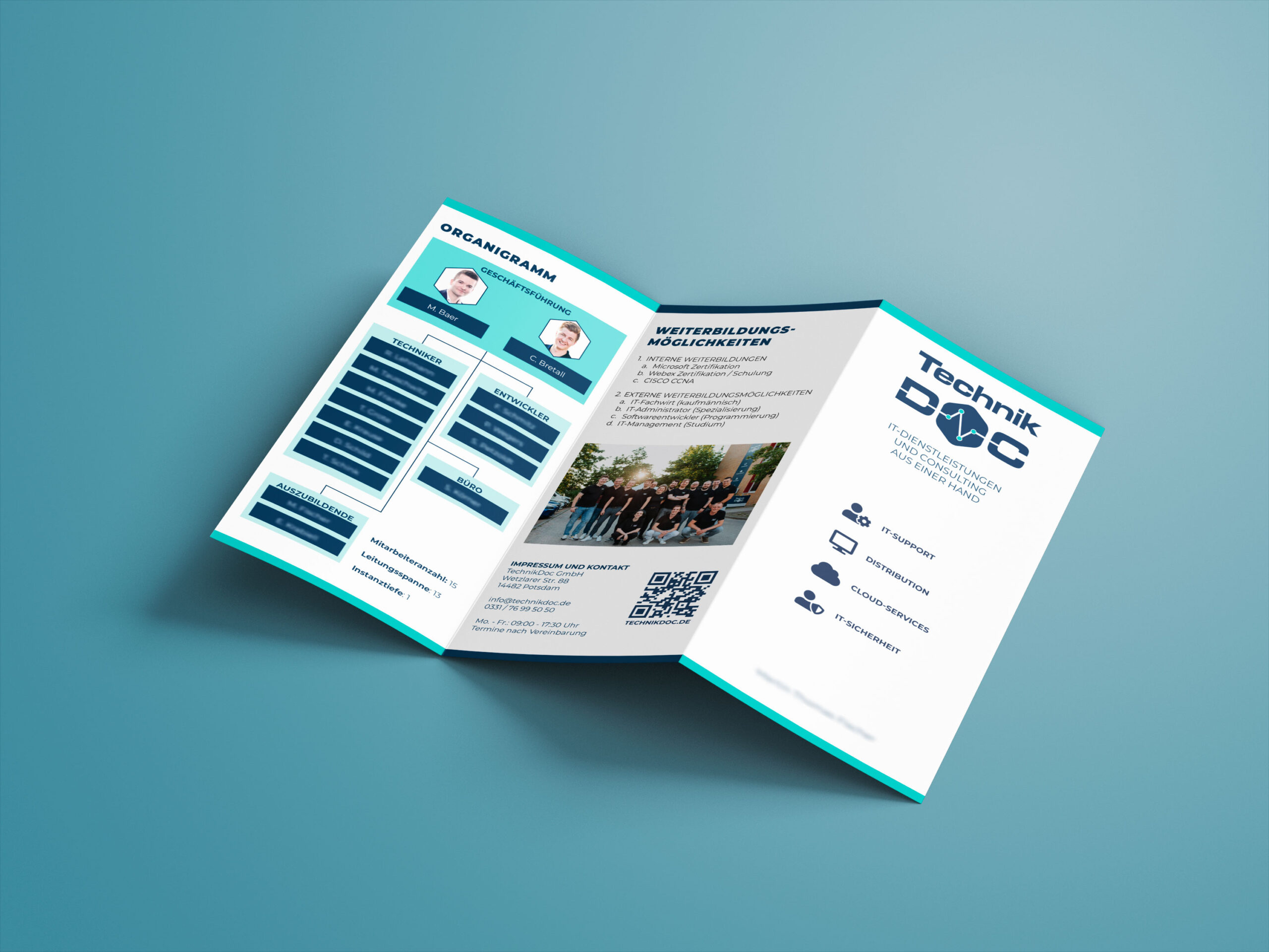 Durch meine platzsparende, aufgeräumte Anordnung der geforderten Elemente entstand zusätzlich die Möglichkeit, ein Teamfoto zu platzieren und die Coverseite nicht mit Informationen überladen zu müssen. Nicht nur mein Freund, sondern auch sein Chef, waren vom Endergebnis des Flyers begeistert.