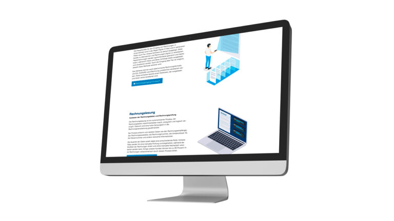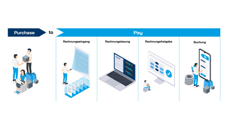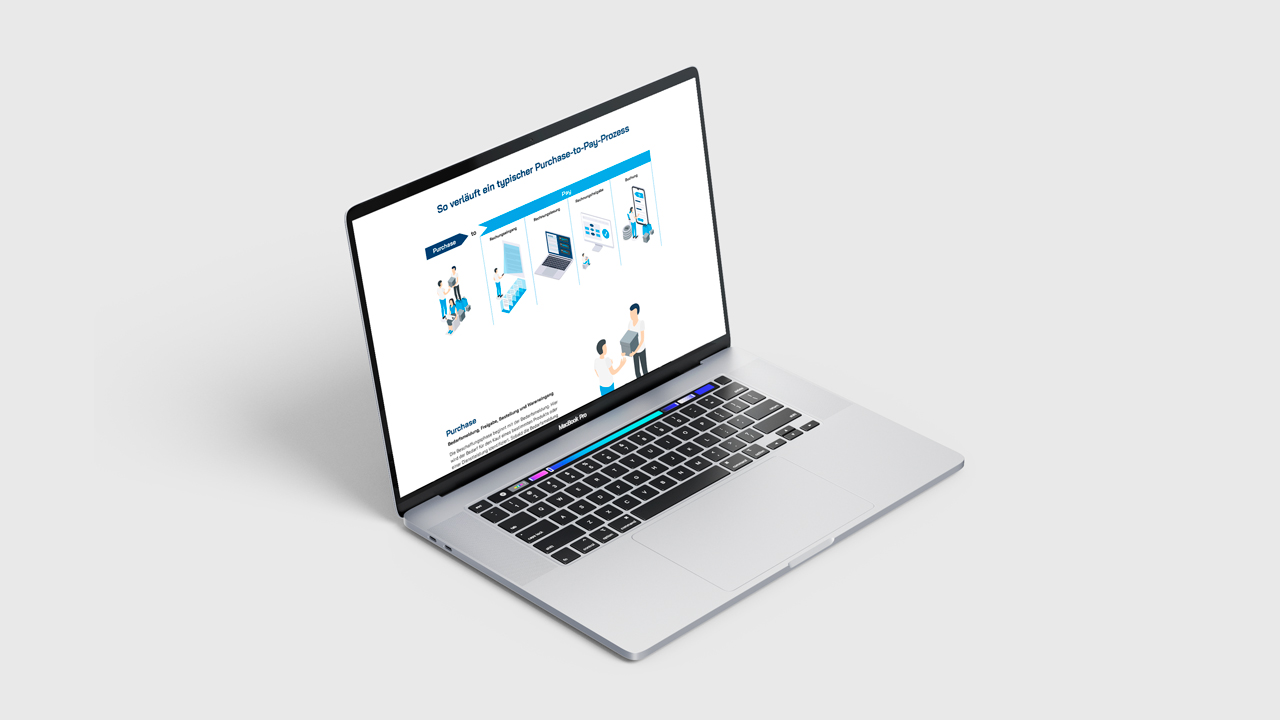 Für das Thema Purchase2Pay entschied ich mich zur Visualisierung des Sachverhaltes Vektorgrafiken zu verwenden, da zusätzlich zu einer Gesamtübersicht auch die Einzelschritte auf der Website erläutert werden sollten. Die Grafik ist daher ähnlich wie ein Comic von links nach rechts zu lesen und zeigt Personen, die im Prozess bekannte Dinge erledigen: Onlinebestellung, Rechnungen erhalten und erfassen, auswerten und nach der Freigabe schließlich die Buchung durchführen.