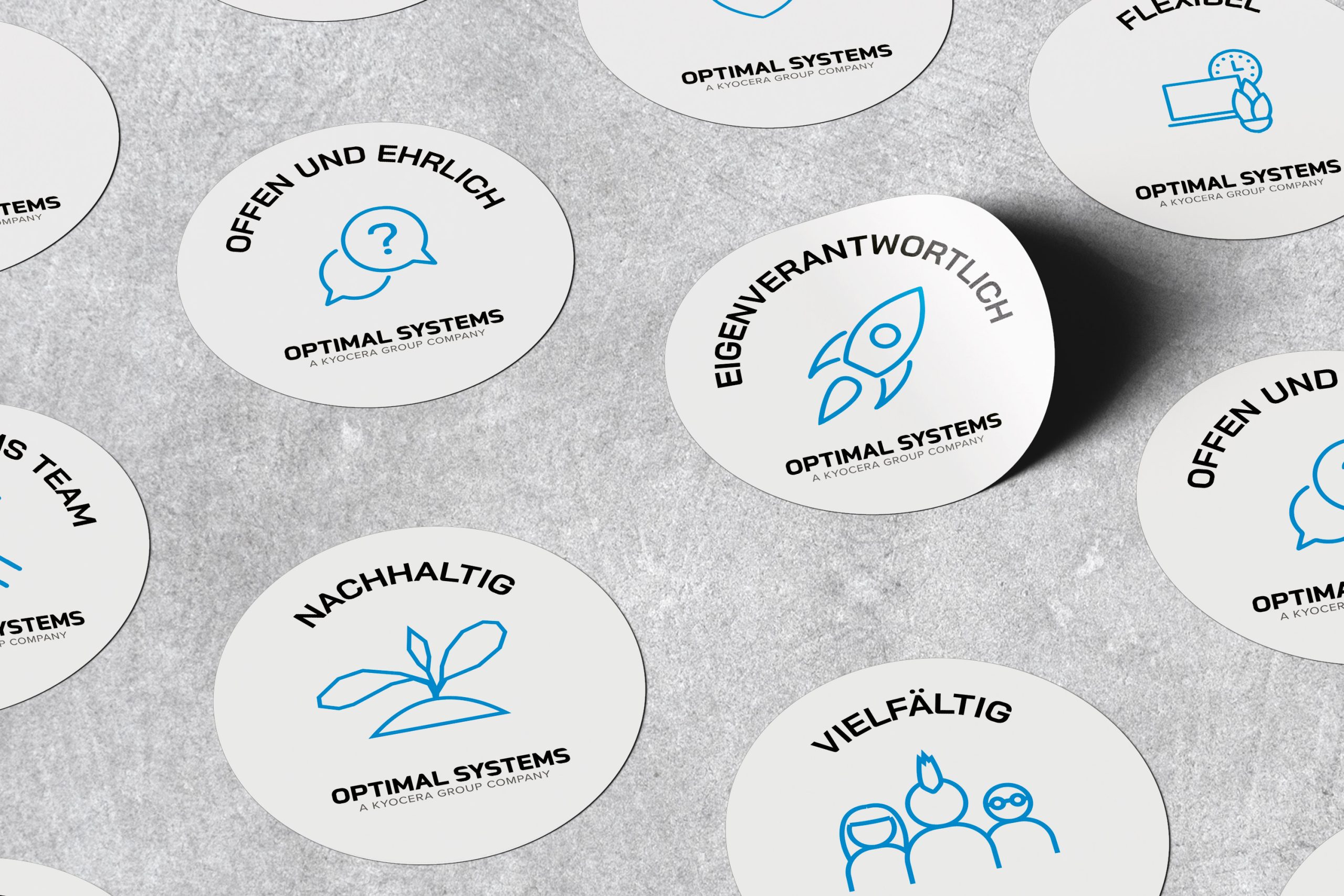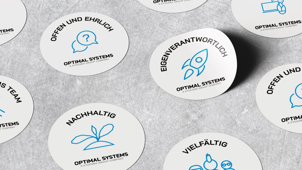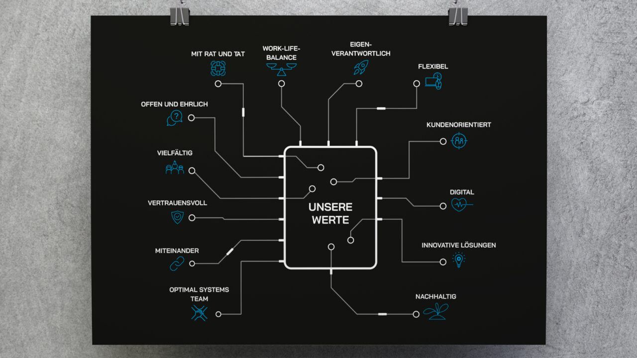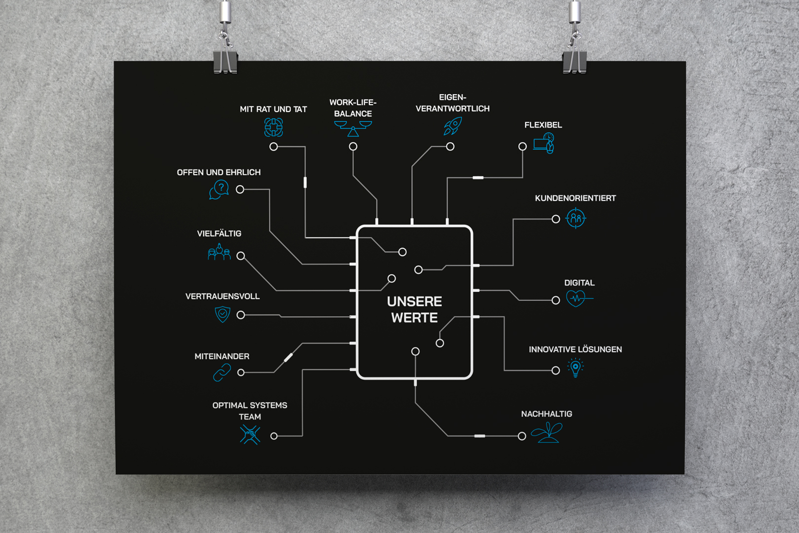 OPTIMAL SYSTEMS hat sich durch eine Mitarbeitendenumfrage 2022 neue Werte als Richtlinie für eine kollegiale Arbeitsatmosphäre gesetzt. Diese sollten graphisch aufbereitet werden, um sie sich jederzeit ansprechend in Erinnerung rufen zu können.
